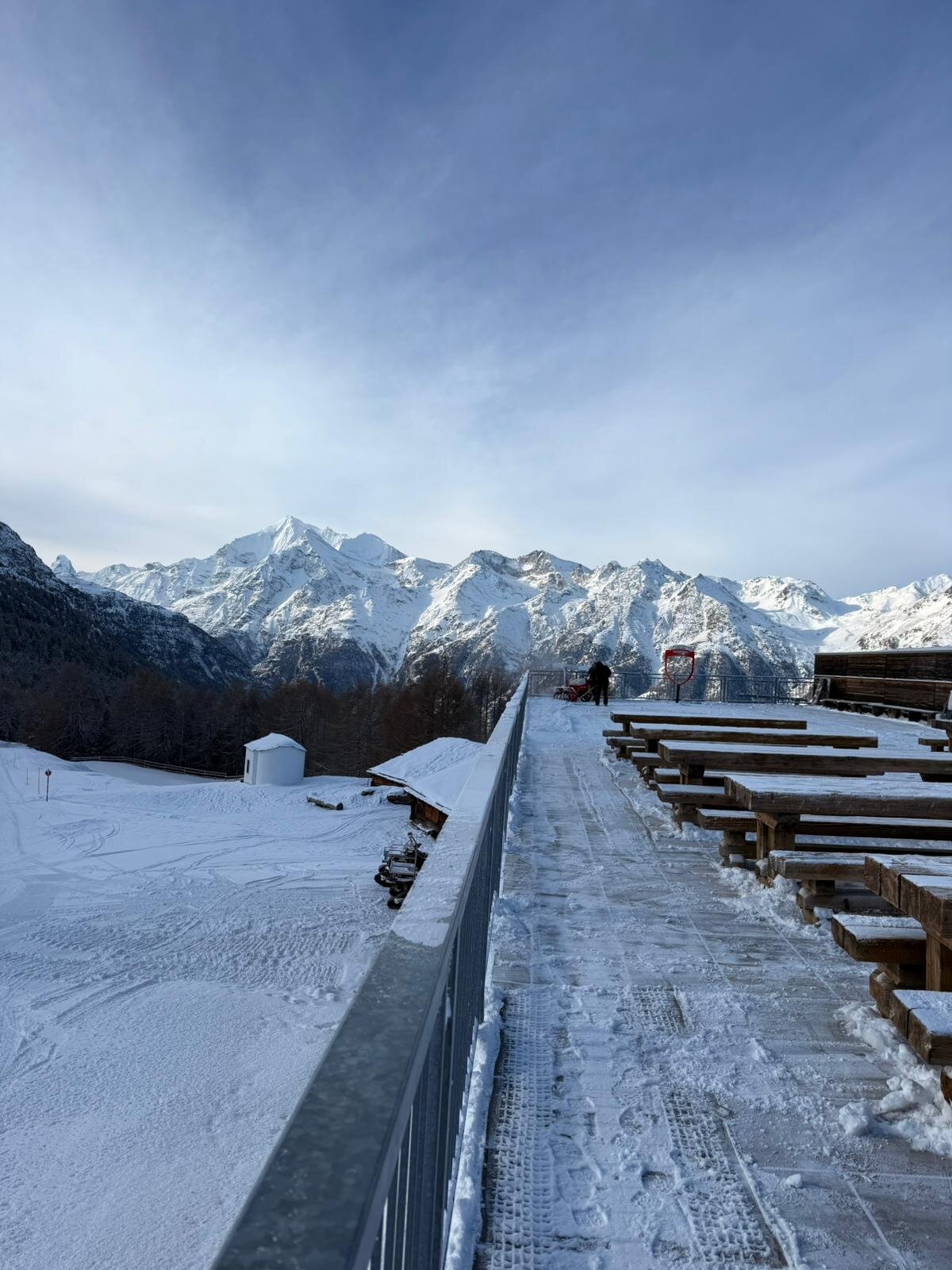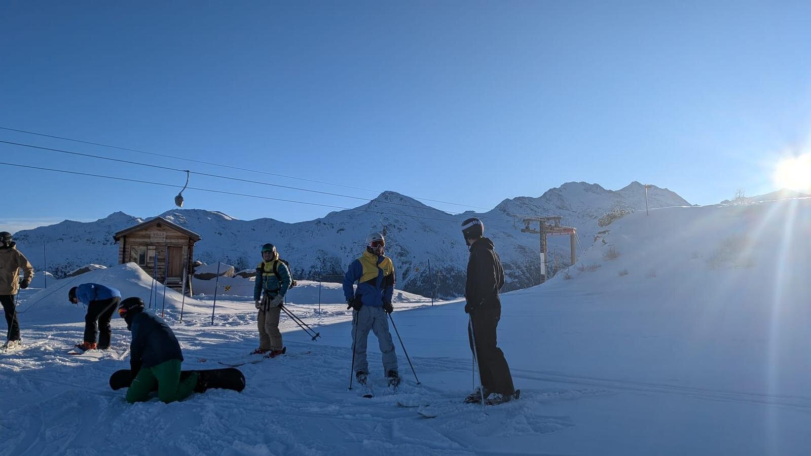 Am Freitag ging es via Autoverlad ab ins Wallis🚙🛣️🚂. Der Abend wurde mit einem feinen Abendessen abgerundet. Ausnahmsweise ging es danach früh ins Bett, damit wir am nächsten Morgen pünktlich mit der ersten Gondel 🚠 auf die Piste stehen. Das frühe Aufstehen hat sich gelohnt. Wir hatten die Pisten zu Beginn fast für uns alleine. Während ein Grossteil der Gruppe auf Ski oder Snowboard🎿⛷️🏂 unterwegs waren, gab es auch Leute, welche beim Winterwandern das atemberaubende Panorama genossen🏔️❄️. Natürlich reichte die Zeit auch noch, um auf der Terrasse bei Aprés-Ski die Sonne zu geniessen🍹🍻☀️😎.